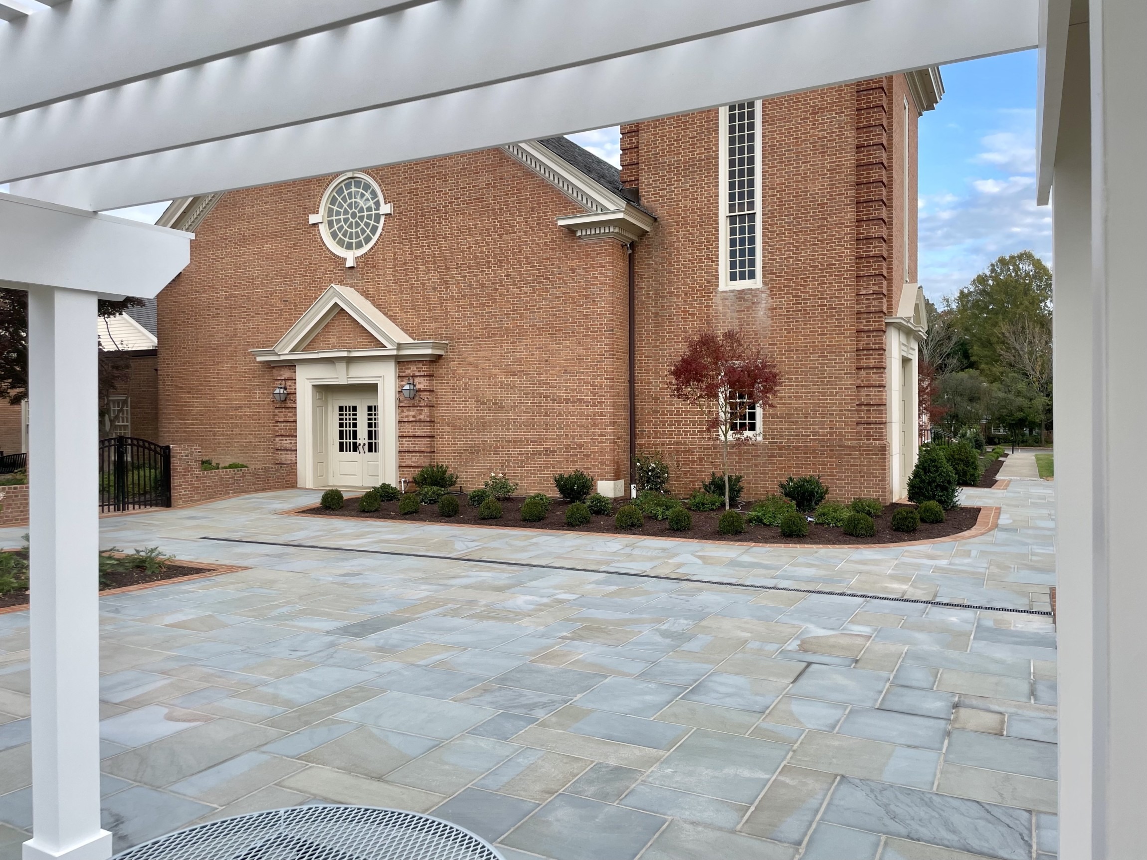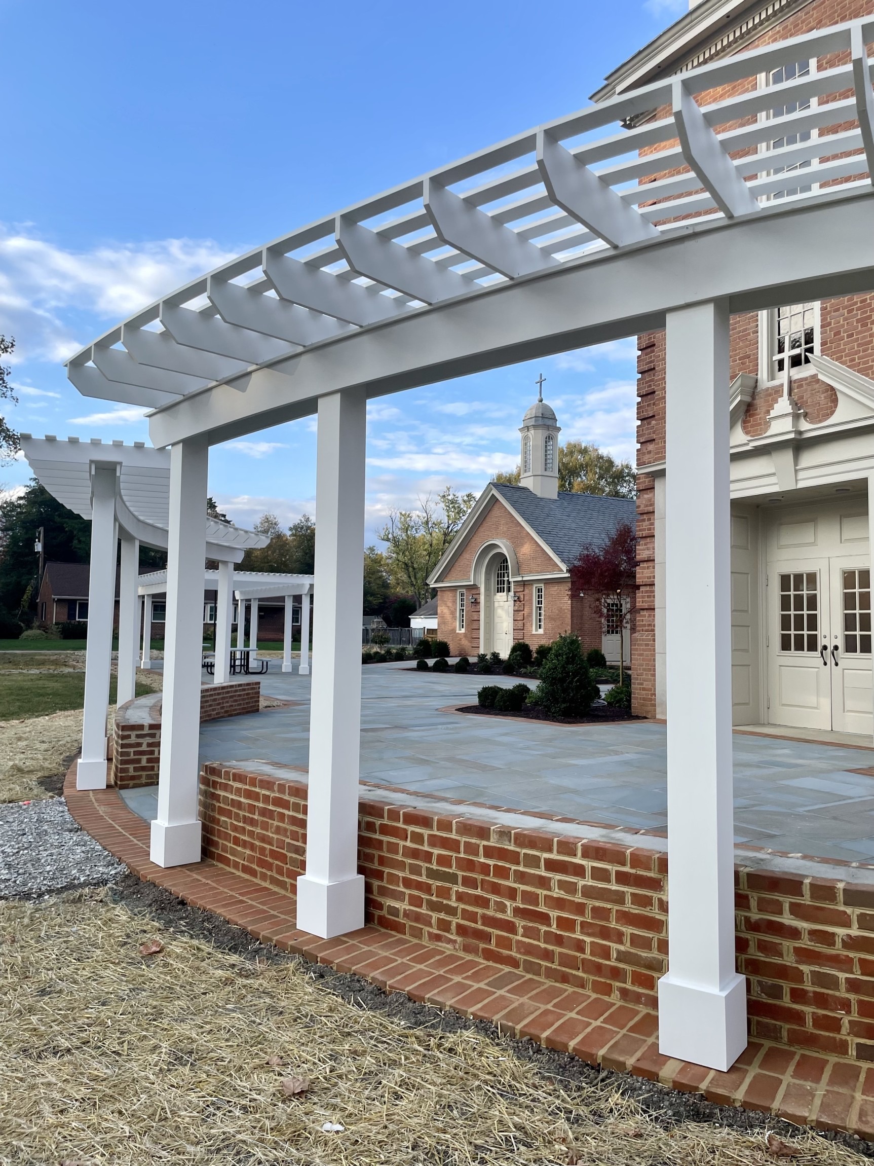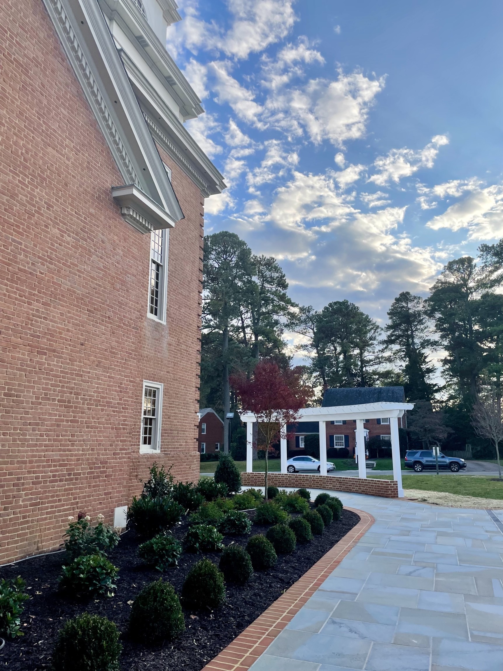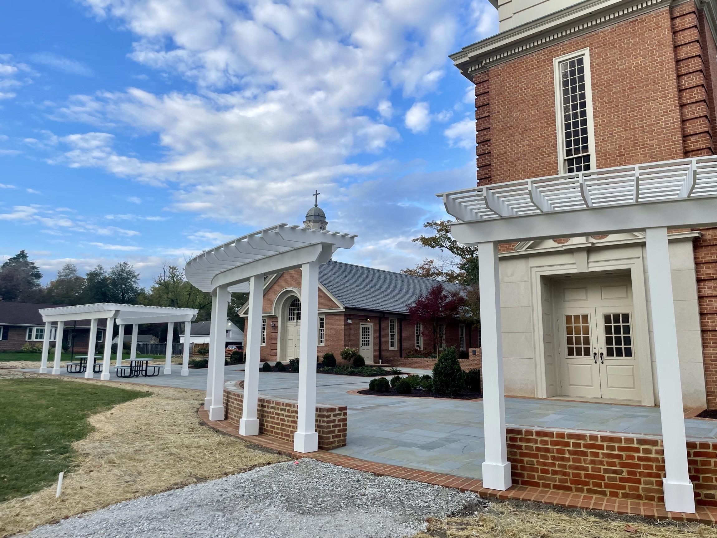 What’s completed? The bluestone and brick plaza that connects our two buildings with accessible entries; the brick seating walls; two shade pergola elements; new plants, trees and garden renovations surrounding the sanctuary and the front of Wilson; irrigation and landscape lighting in the new garden beds; the large, dying maple was removed near Wilson Hall and other large trees on campus trimmed by arborists; and power washing of the plaza and brick portions of the sanctuary walls.