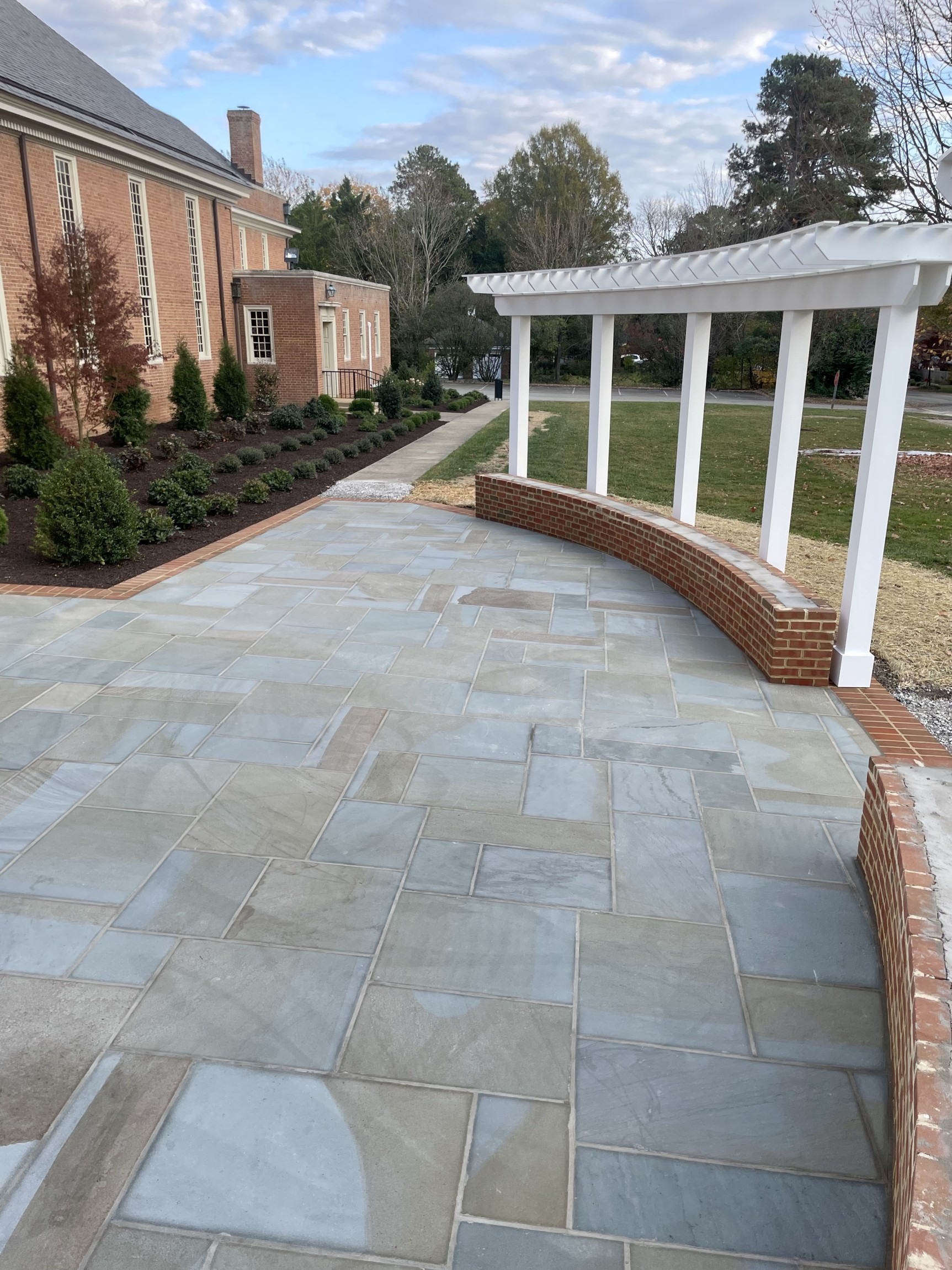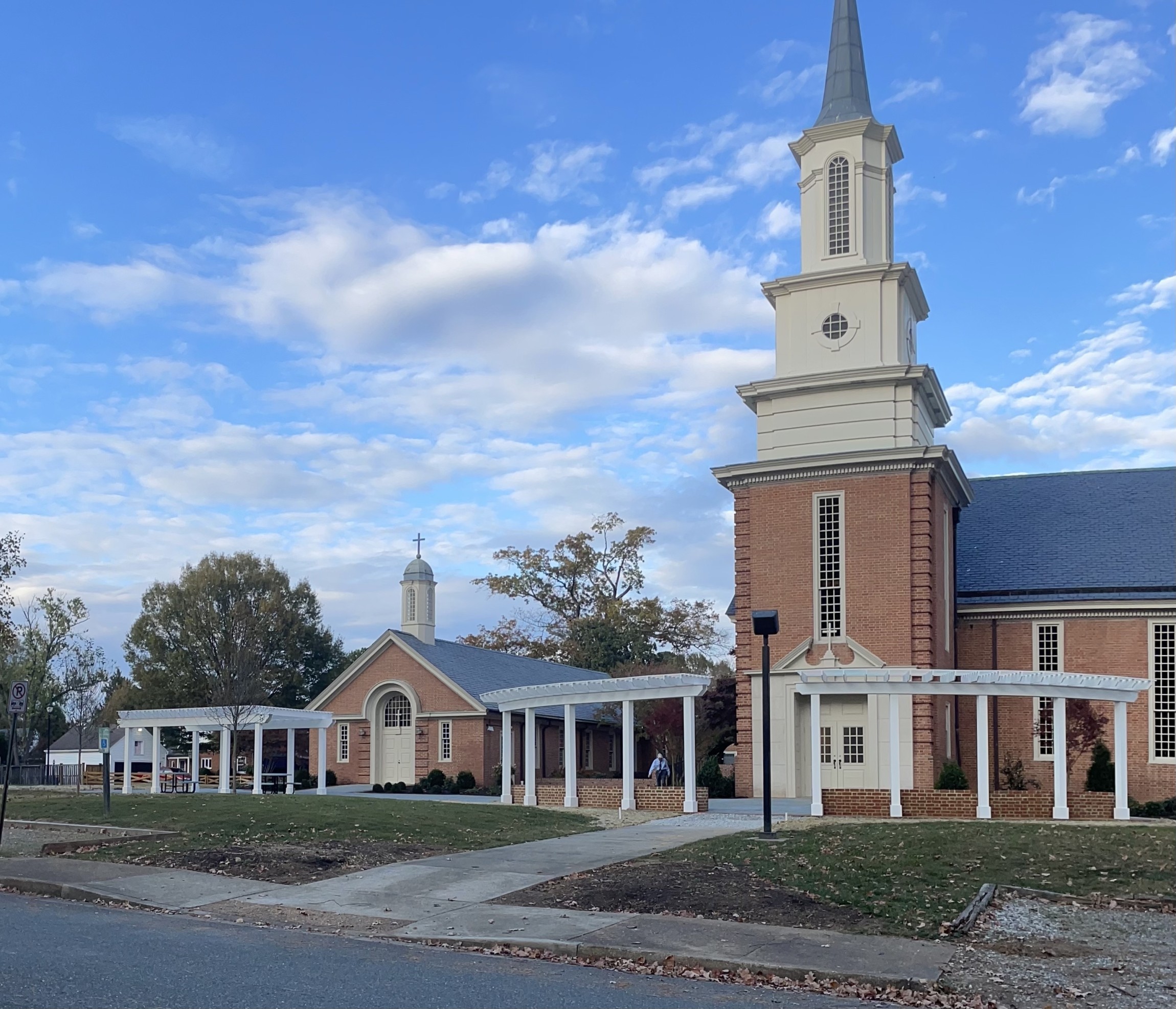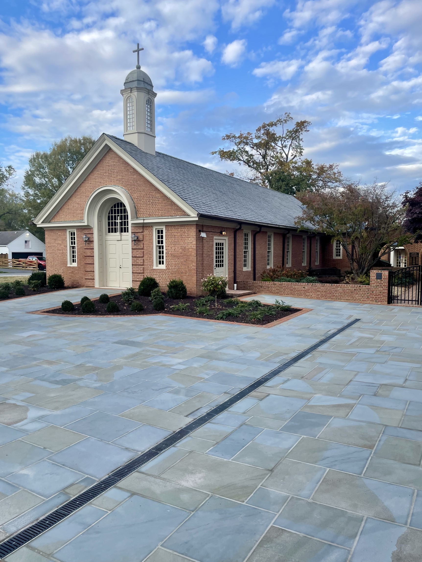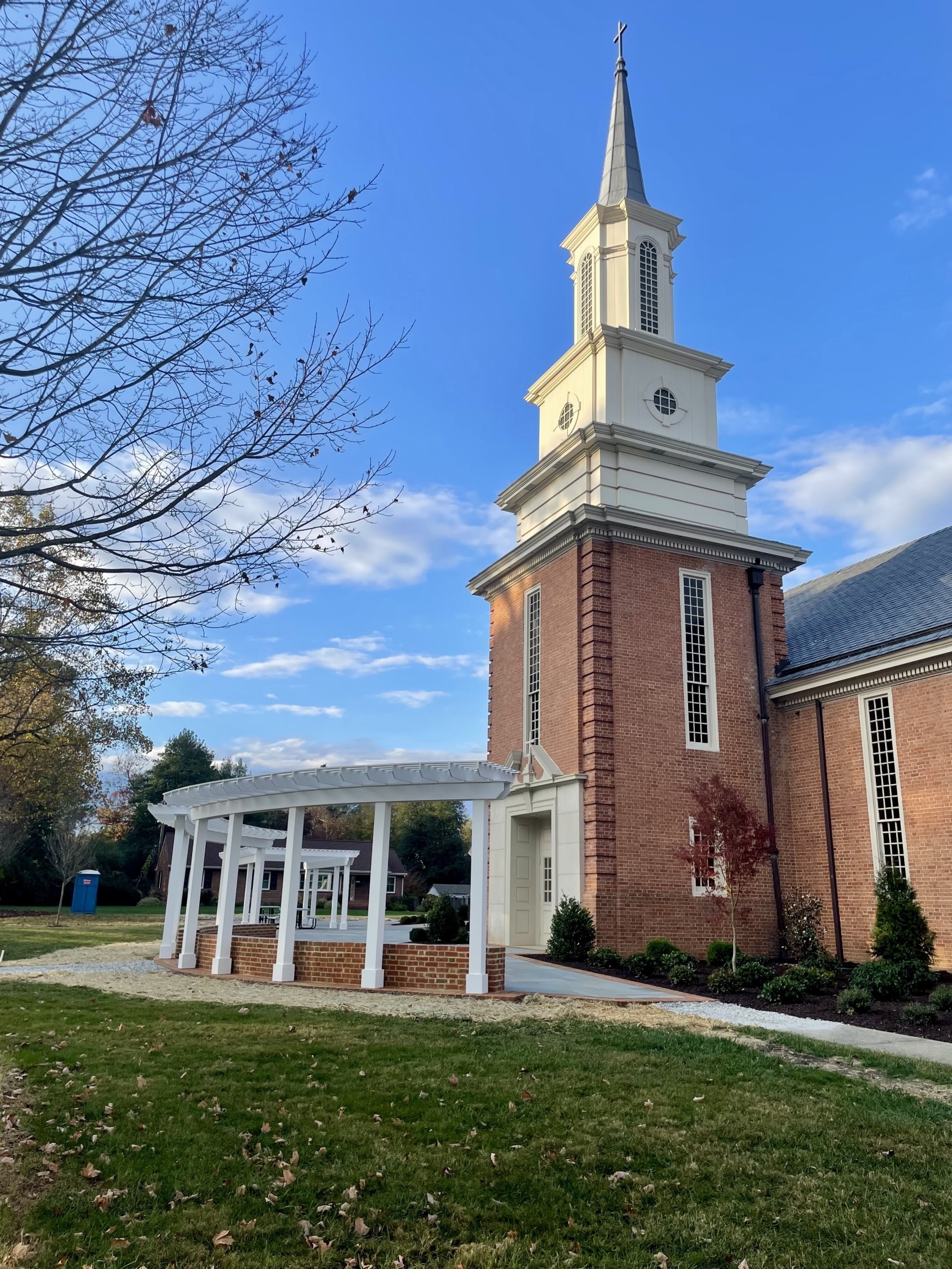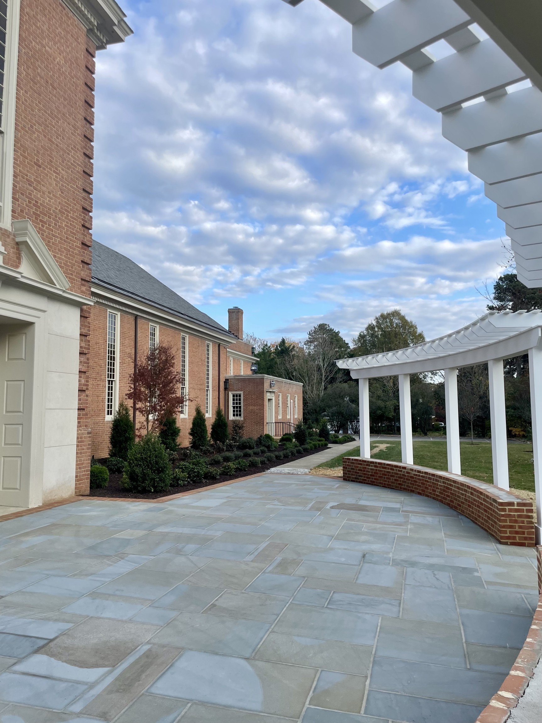 What’s completed? The bluestone and brick plaza that connects our two buildings with accessible entries; the brick seating walls; two shade pergola elements; new plants, trees and garden renovations surrounding the sanctuary and the front of Wilson; irrigation and landscape lighting in the new garden beds; the large, dying maple was removed near Wilson Hall and other large trees on campus trimmed by arborists; and power washing of the plaza and brick portions of the sanctuary walls.