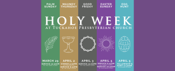 Tuckahoe Presbyterian Church Holy Week Schedule March 31 Palm Sunday 10:30am Blessing and Procession of the Palms April 2 Maundy Thursday 5:30pm Dinner in Duntreath 6:30pm Service in the Sanctuary April 3 Good Friday 12:00pm Service in the Sanctuary* April 5 Easter Sunday 6:20am Easter Sunrise Service on the Lawn 10:30am Easter Service | Flowering the Cross 11:30am Easter Egg Hunt and…