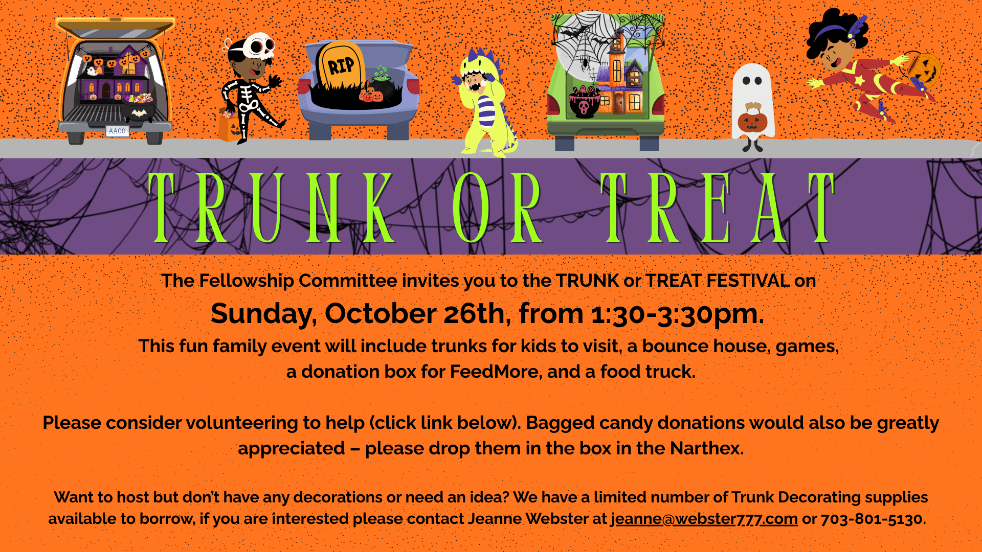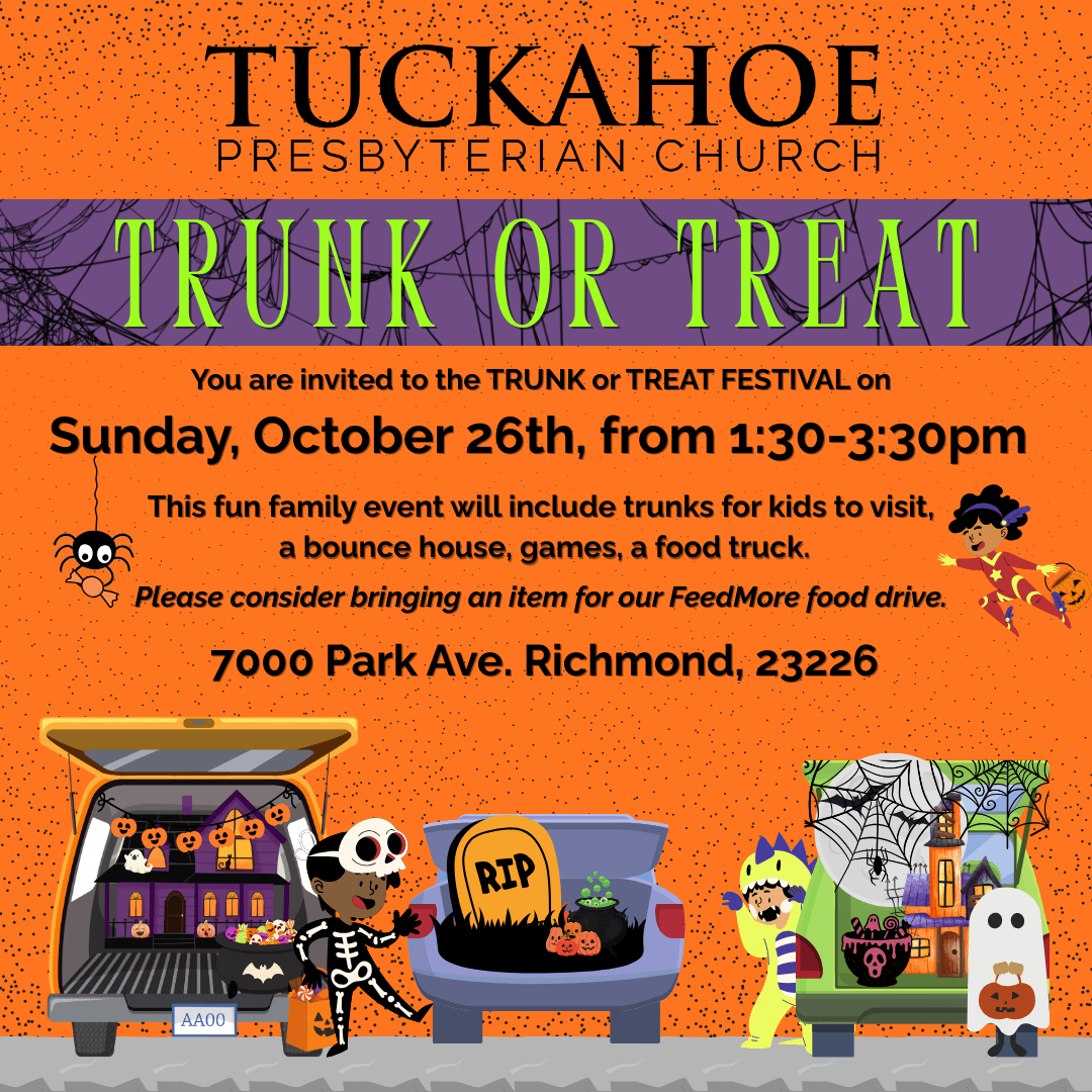 Join in the fun at “Trunk or Treat and More!” To Host a Trunk, help with activities, help with set-up, etc., please click here: Volunteer Sign-Up Questions? Contact Jeanne Webster or Lilly Chervenak (info found on Breeze). If you would like to invite someone – here is an INVITE FLYER to send or print!