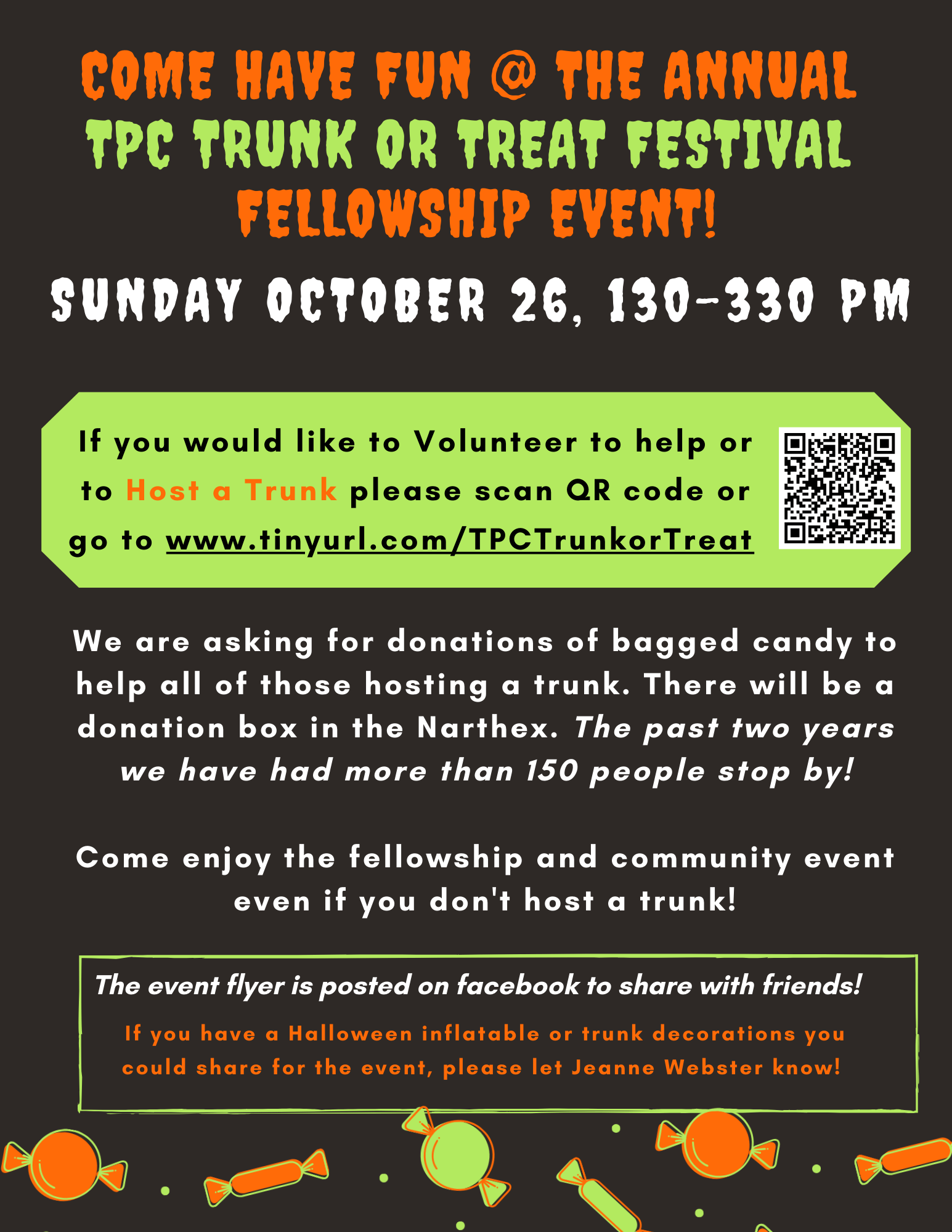 Join in the fun at “Trunk or Treat and More!” To Host a Trunk, help with activities, help with set-up, etc., please click here: Volunteer Sign-Up Questions? Contact Jeanne Webster or Lilly Chervenak (info found on Breeze). If you would like to invite someone – here is an INVITE FLYER to send or print!